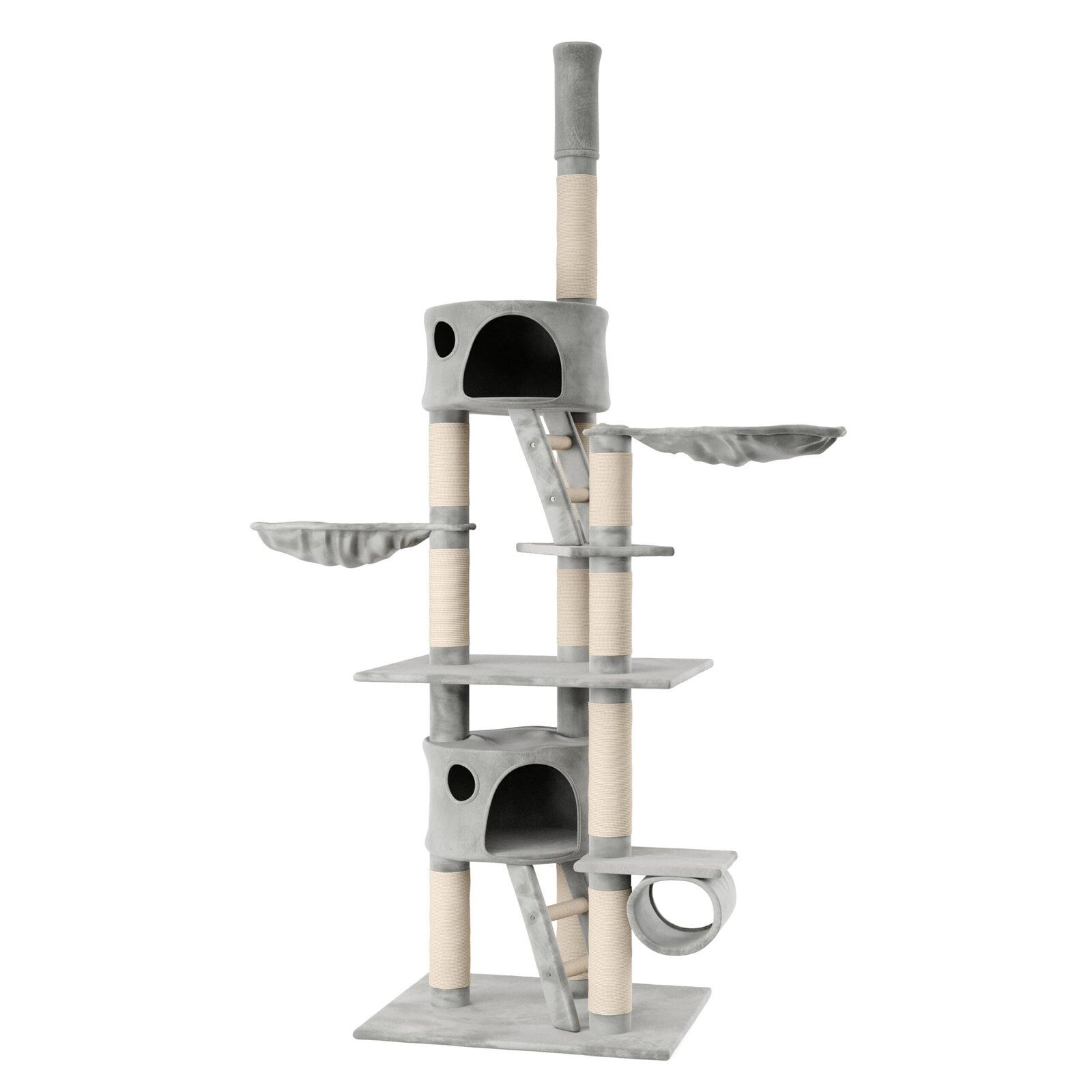 Tiragraffi per gatti FELIX 240 cm grigio Hai un soggiorno con un soffitto alto? Sorprendi il tuo tesoro con questa torre da arrampicata XXL! Le scale e le piattaforme offrono divertimento durante l’arrampicata: il tuo gatto può pulirsi gli artigli sui tronchi di sisal. Se ha bisogno di una pausa può fare un riposino nella cesta o nella casetta. Acquista subito questo tiragraffi per gatti, facile da pulire e duraturo!